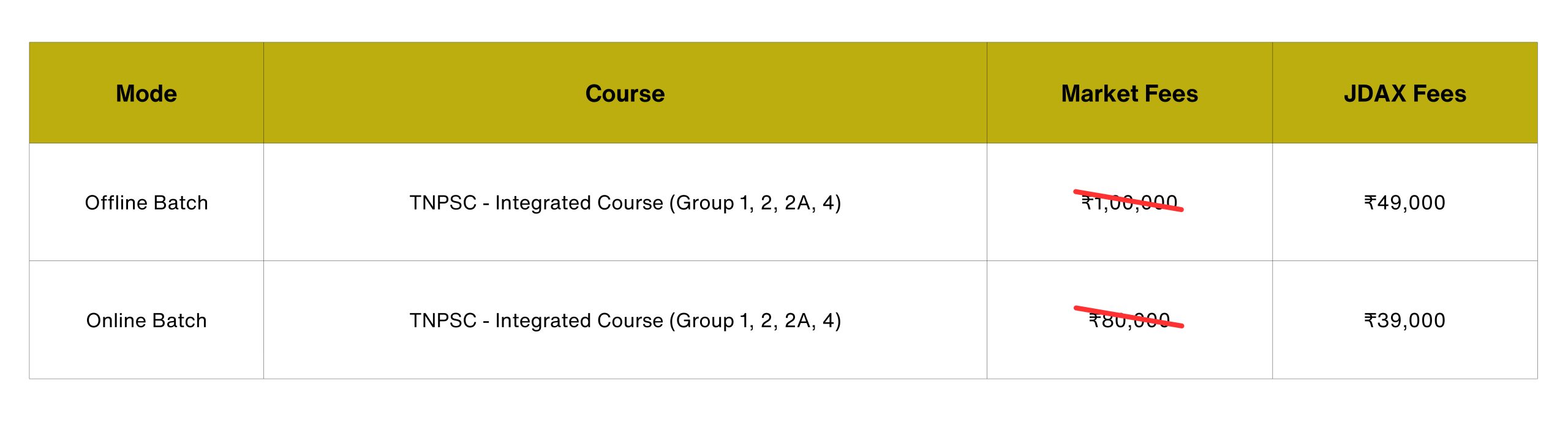 JD Academy of Excellence (JDAX) is committed to making top-quality government exam preparation accessible and affordable. Whether you’re aiming for the prestigious UPSC, competitive TNPSC roles, or SSC, Banking, and Railway jobs, JDAX offers comprehensive coaching with structured batches, expert faculty, flexible schedules, and scholarship-based fee discounts. Our programs are designed for both offline and online learners, with installment plans and hostel facilities available for eligible students.